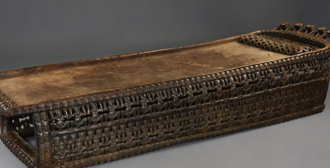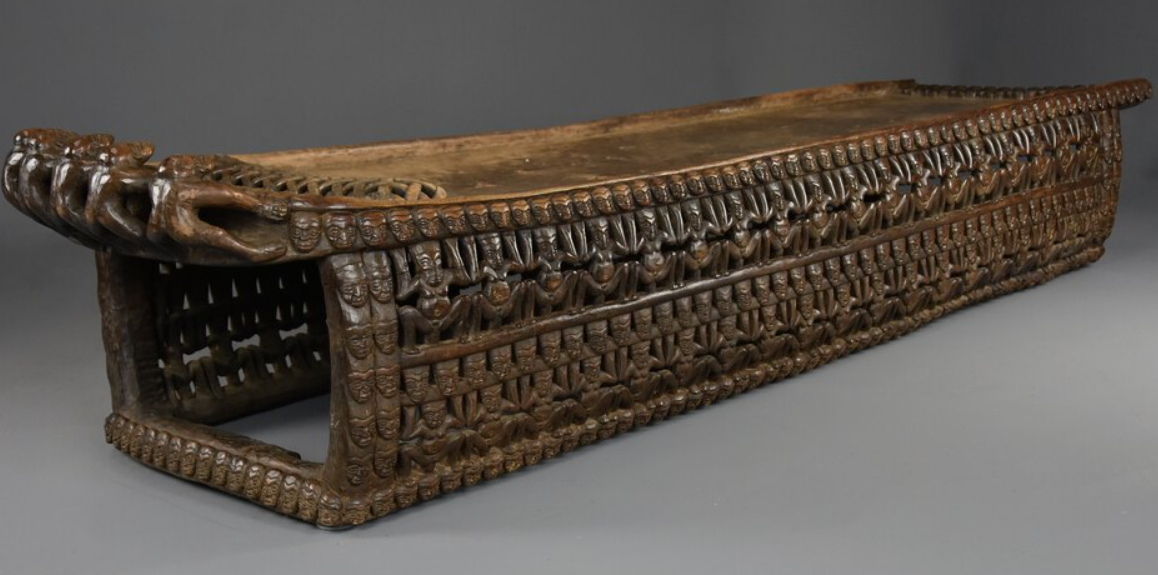 In Bamileke culture, ceremonial beds were sacred spaces reserved for kings and chiefs, believed to serve as places of spiritual guidance and ancestral connection. The carved faces and figures symbolize ancestors, warriors, and protective spirits.