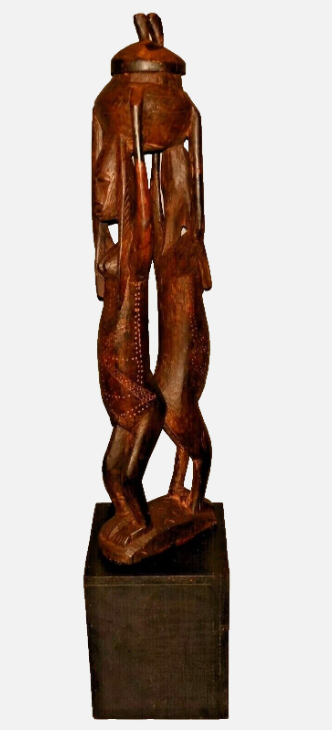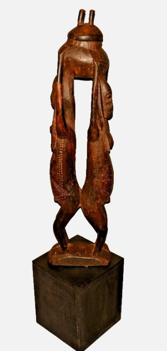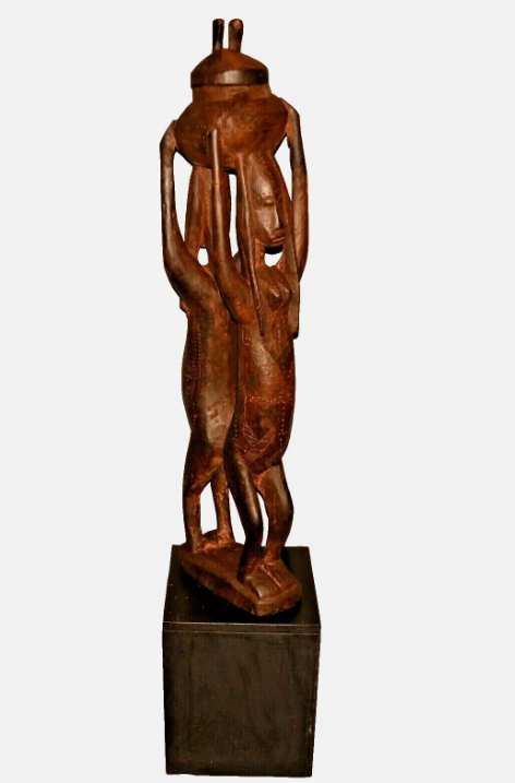 This life-size African carved sculpture depicts two human figures standing together in a unified composition. Hand-carved from wood, the figures embody themes of partnership, identity, and cultural continuity.